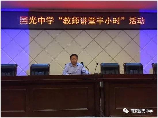为分享在教育教学、专业成长的成功经验,学校安排骨干教师面向全体教师开设国光中学教师讲堂“半小时”。 9月、10月、11月教师讲堂“半小时”分别由吴智勇、陈毓煌、张斌三位老师作了有关论文写作、如何提高学习的有效性、学科竞赛辅导的演讲。