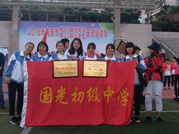 10月28-30日在实验中学举行的南安市第45届中学生体育联赛田径比赛上,国光初级中学代表队弘扬“公毅”校训,团结拼搏、不畏强手,以团体总分206分的优异成绩,勇夺初中甲组团体总分第一名和大赛组委会颁发的“体育道德风尚奖”,取得了运动成绩和精神文明的双丰收!