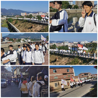上午7:45—8:00,远足出征仪式在新华园操场举行,黄志祥、刘加庆老师分别做了动员讲话,并向初三年段授校旗和活动主题旗。初三年段师生近600人踏上征程。
