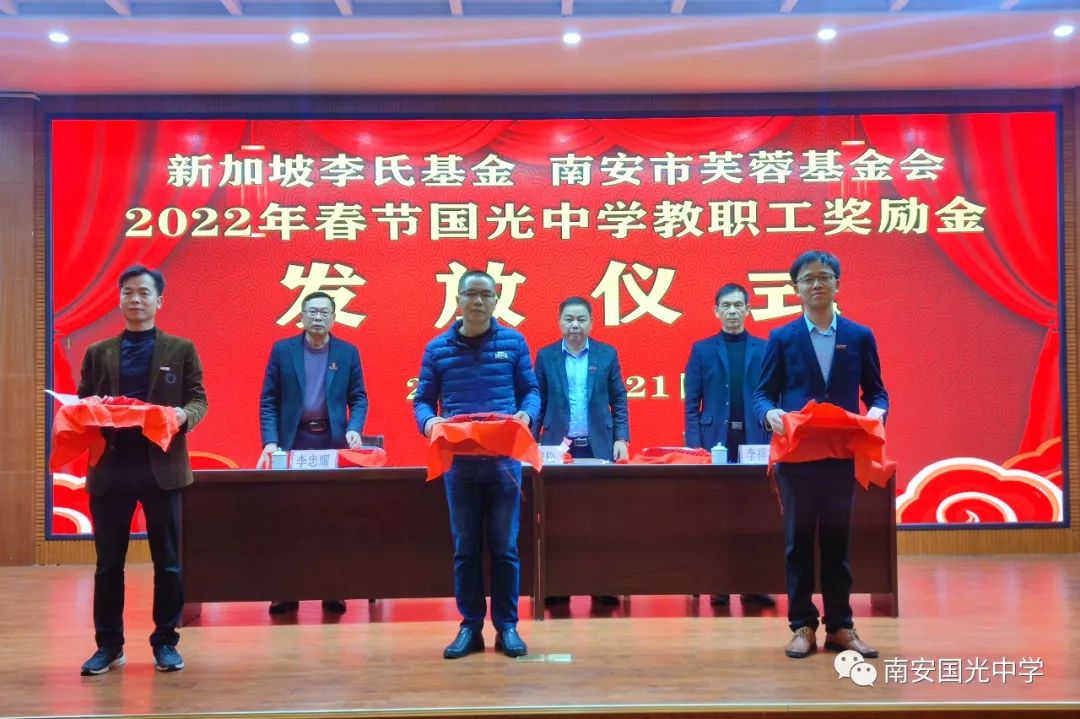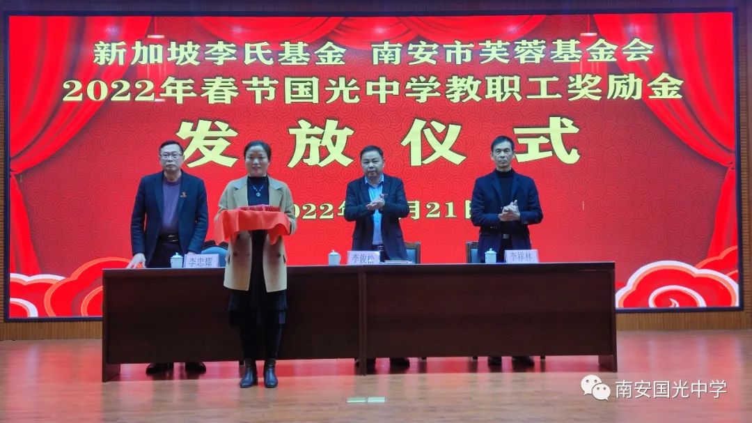 2021年,是值得国人铭记的历史之年,也是值得“国人”破防的国光之年。面对中高考综合改革的纵深发展,“双减”政策下的教育新形式,南安教育超越发展的新要求,福建省示范性高中创建、福建省义务教育教改示范性建设终期评估的重任,国光人勠力同心,再创佳绩:高考674总分惊艳排行榜;中考成绩位居南安前列;获评“福建省第二届文明校园”;获评“福建省普通高中课程改革基地校”;获评“福建省平安校园”;绩效考核、综治平安考核获优秀等级;福建省示范性高中创建顺利通过泉州考评;福建省义务教育教改示范性建设终期评估通过南安考评;“光前精神育人”办学特色成果登上《福建日报》移动端平台……近几年来,新加坡李氏基金、南安市芙蓉基金会加大了对国光中学的支持力度,投入巨资支持学校通过一级达标高中复评;2019年、2020年这两年,每年均拨出专款130万元设立提升教育教学质量专项资金;每年拨出70万元为光前班学生提供优厚的奖学金;每年拨出专款发放重金奖励教职员工,提升教师福利待遇,2019年是110万元,去年、今年都是112万元。同时,在支持教师外出学习交流、改善办学条件、奖教助学等方面予以大力支持。几年来,据不完全统计,资助的金额高达2000多万元,支持力度之大、金额之高,影响之大,在整个南安市首屈一指,得到了各级领导、社会各界、国光中学师生及6万多名校友、广大人民群众的高度赞扬。这一笔笔沉甸甸的善款,饱含着侨亲对国光的厚爱,饱含对全体教职工的关爱,也饱含着对对学校发展的殷切期望。奖励金的发放,既是对国光中学广大教职员工取得的成绩的充分肯定与奖励,又是对广大教职员工的勉励与期待。第二个百年奋斗新征程已起航,国光发展也进入新时代。国光的发展注定与时代同频共振,国光人也将与无数筑梦者一起走在新的“赶考”路上。如何适应教育发展新形势、新要求,贯彻落实“双减”政策;怎样五育并举、提质增效;如何进一步推进福建省示范性高中创建工作;怎样做好基础教育国家级教学成果推广……面对这些重要的发展节点,让我们带着对新加坡李氏基金、南安市芙蓉基金会的感恩之心,用实际行动投入到国光教育事业中来:我们要以争创福建省示范性普通高中建设学校和福建省义务教育教改示范性建设学校为目标,紧跟中高考综合改革步伐,全面提高学校教育教学质量,凝聚共识、汇聚智慧、积聚力量、奋发图强,开创国光中学发展新局面!唯有奋斗才不会辜负李光前先生报国兴学的初心;唯有发展才能回报李成智主席、新加坡李氏基金、南安市芙蓉基金会的隆德善举。我们坚信,在习近平新时代中国特色社会主义思想的指引下,在南安市委市政府的正确领导下,在李成智主席、新加坡李氏基金及南安市芙蓉基金会的关心支持下,在海内外侨亲校友和社会各界的助力下,在全体教职员工的共同努力下,国光中学的教育明天一定会更加美好!