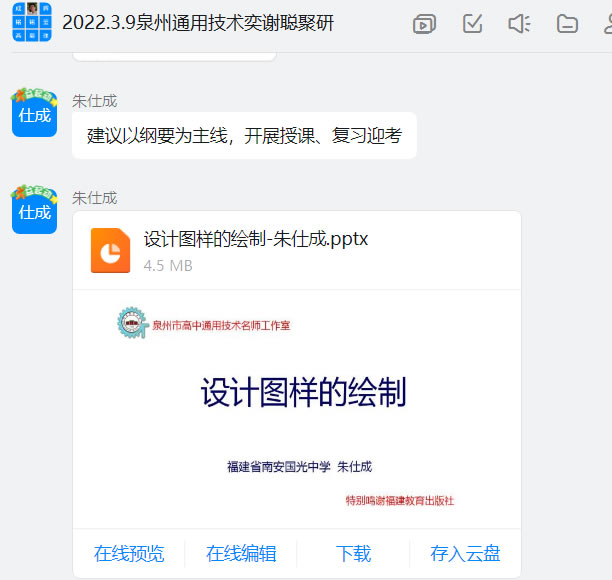 此次疫情比较突然,居家学习不同于学校的课堂教学,家庭的客观条件、学生的自主学习能力都存在一定的差异,如何在让学生、家长都没有负担的前提下,让网上教学做到顺畅、有效成为了老师们集中攻坚的难点。为此,朱仕成名师工作室首先将电子教材、教师用书、教学资源平台分享到通用技术学科相关的交流群,为老师们备课、研究教材提供保障;同时在充分调研教师需求的基础上,积极开展线上教研活动,为老师们搭建网络交流平台,促进老师们互相研讨切磋,不断提升线上教育教学水平;此外,朱老师还为大家提供优质课件,包括考点解析、章节重难点、典例分析、适应练习、设计体验等内容,给老师们的线上教学工作送去一片甘霖。