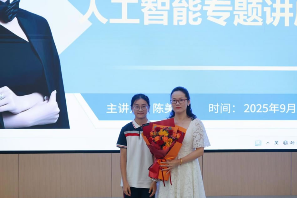 仪式结束后,闽南科技学院计算机信息学院智能大数据系主任陈美龙为在场师生带来了题为 “人工智能前沿与应用” 的专题讲座。陈主任以通俗易懂的语言,结合生动案例,深入浅出地介绍了 AI 技术的发展现状、核心应用场景及未来趋势。讲座过程中,同学们积极提问,与陈主任展开热烈互动,现场氛围十分活跃。此次讲座,不仅让同学们学到了丰富的科技知识,更激发了大家探索科学奥秘的热情。