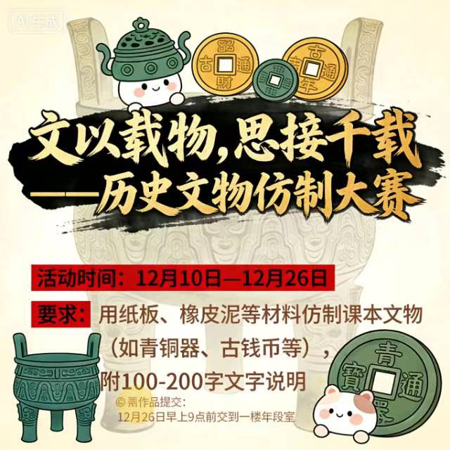 为深化历史学科实践育人成效,引导学生近距离触摸历史脉搏、感受中华文明的博大精深,近日,国光中学初一年级以“文以载物,思接千载”为主题的历史文物仿制大赛圆满落下帷幕。本次活动自启动以来,便得到了同学们的热烈响应与积极参与,大家以课本中的文物知识为蓝本,开启了一场跨越千年的“文明对话”。