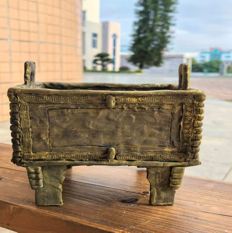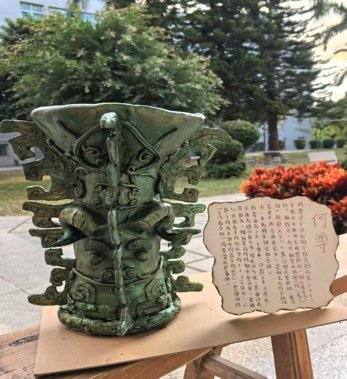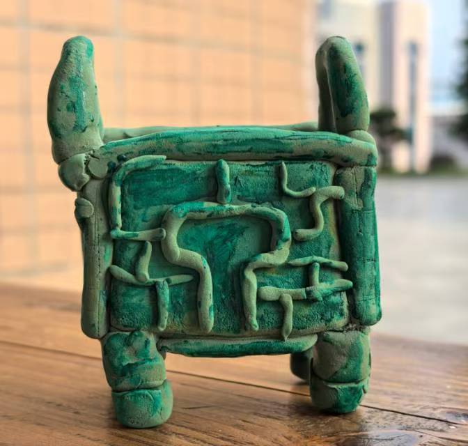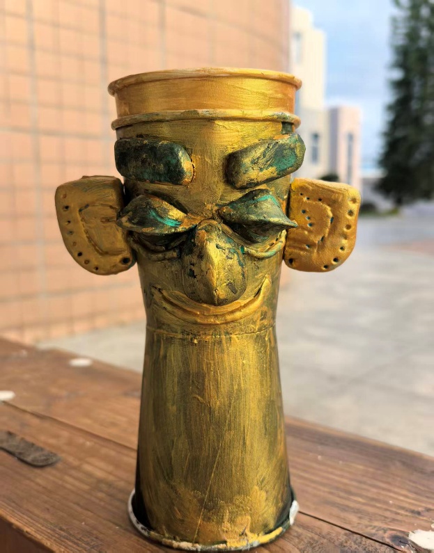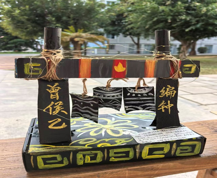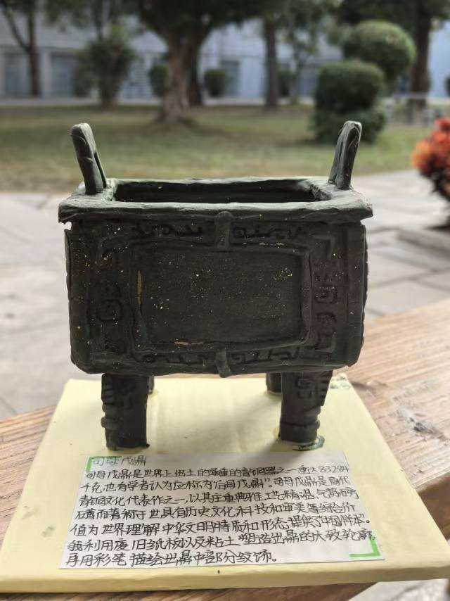 在为期半个月的创作周期里,同学们充分发挥想象力与创造力,摒弃复杂的专业工具,仅用纸板、橡皮泥等简易材料,化身“小小文物匠人”,从文物的造型、纹饰到细节肌理,都进行了细致的揣摩与还原。当一件件凝聚着巧思与汗水的仿制作品集中亮相时,立刻吸引了全校师生的目光。何尊之上,古朴的铭文仿佛诉说着西周的礼乐文明;司母戊鼎以雄浑厚重的姿态,尽显青铜时代的工艺巅峰;曾侯乙编钟错落排列,仿佛仍能奏响穿越千年的宫廷雅乐;神秘诡谲的青铜面具,让人窥见古蜀文明的独特魅力;质朴的陶仓,承载着古代农耕社会的生活智慧;锋利的勾践剑,似在诉说春秋争霸的烽火岁月;华贵璀璨的黄金面具,则尽显古文明的奢华与神秘。每一件作品都惟妙惟肖,细节之处尽显同学们对历史文物的深刻理解与用心雕琢。