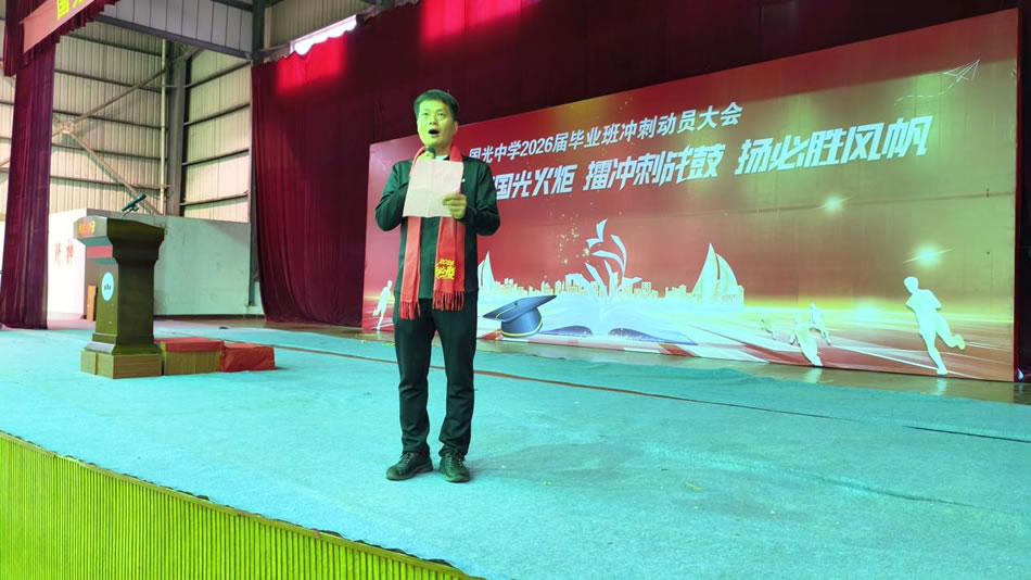 李俊松校长发表了题为《狭路相逢勇者胜》的冲刺动员讲话。他以电视剧《亮剑》中的经典精神为引,深刻阐释了高考“狭路相逢”的本质。他指出,面对高考这一人生的重要挑战,全体学子必须具备敢于“亮剑”的胆魄,将三年积淀的知识与能力化作最锋利的宝剑;必须具备心无旁骛的专注,将一百天拆解成一个个扎实的“今天”,用过程的踏实对抗结果的焦虑;必须具备血战到底的意志,在疲惫与波动中淬炼真金,以“明知山有虎,偏向虎山行”的倔强,完成青春的淬火与升华。他特别寄语家长,要成为孩子情感的“避风港”,用家庭的温暖照亮孩子前行的道路。最后,他振臂高呼:“狭路相逢,勇者必胜!高考必胜!国光必胜!”铿锵有力的誓言,点燃了全场师生的热血与豪情。