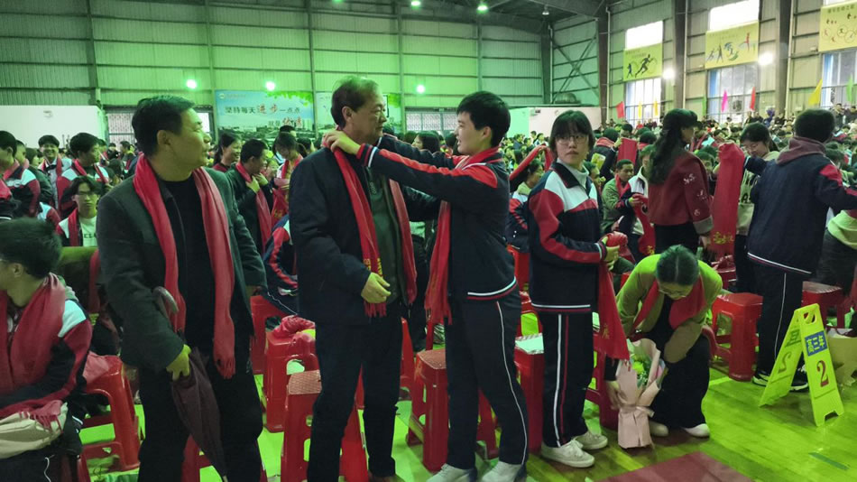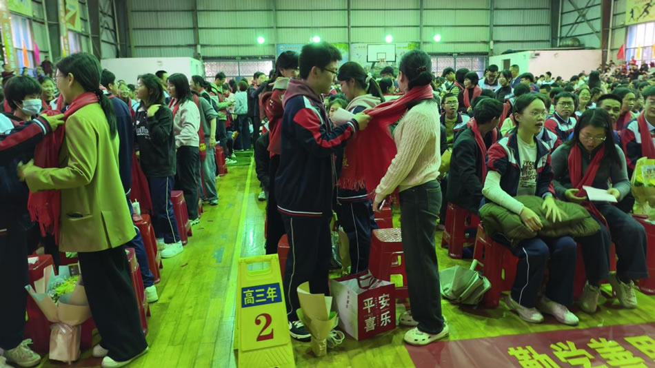 宣誓过后,大会现场上演了温馨感人的一幕——亲子互动环节。伴随着轻柔的音乐,学生们亲手为父母系上印有“2026年高考必胜”字样的红围巾,父母则为孩子戴上另一条红围巾,并送上深情的拥抱与鼓励的寄语。一条条红围巾,宛如爱的纽带,联结着两代人的心;一句句朴实的话语,饱含着父母的殷殷期盼与无尽关怀。场面温馨而动人,这份来自家庭的温暖力量,将成为学子们冲刺路上最坚实的后盾。