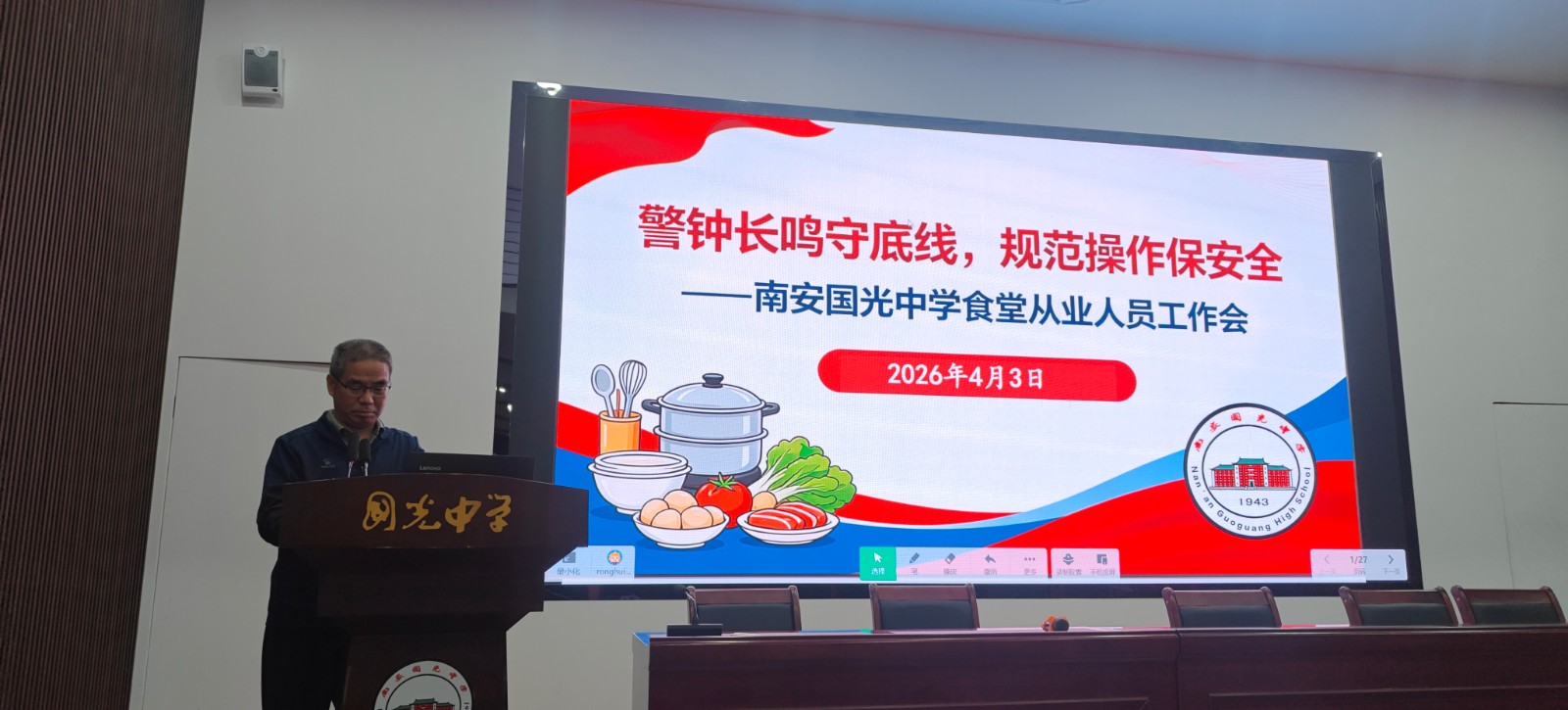 为深入推进健康学校建设,严格落实《校园食品安全“十必须”》《学校食堂工作人员“十不准”》要求,切实筑牢校园食品安全防线,4月3日下午,国光中学在南侨楼会议室召开食堂工作人员及管理人员专题工作会议。学校食品安全总监的戴荣辉副校长出席会议并作专题培训,全体食堂从业人员、食堂管理人员及后勤相关负责人参加会议。