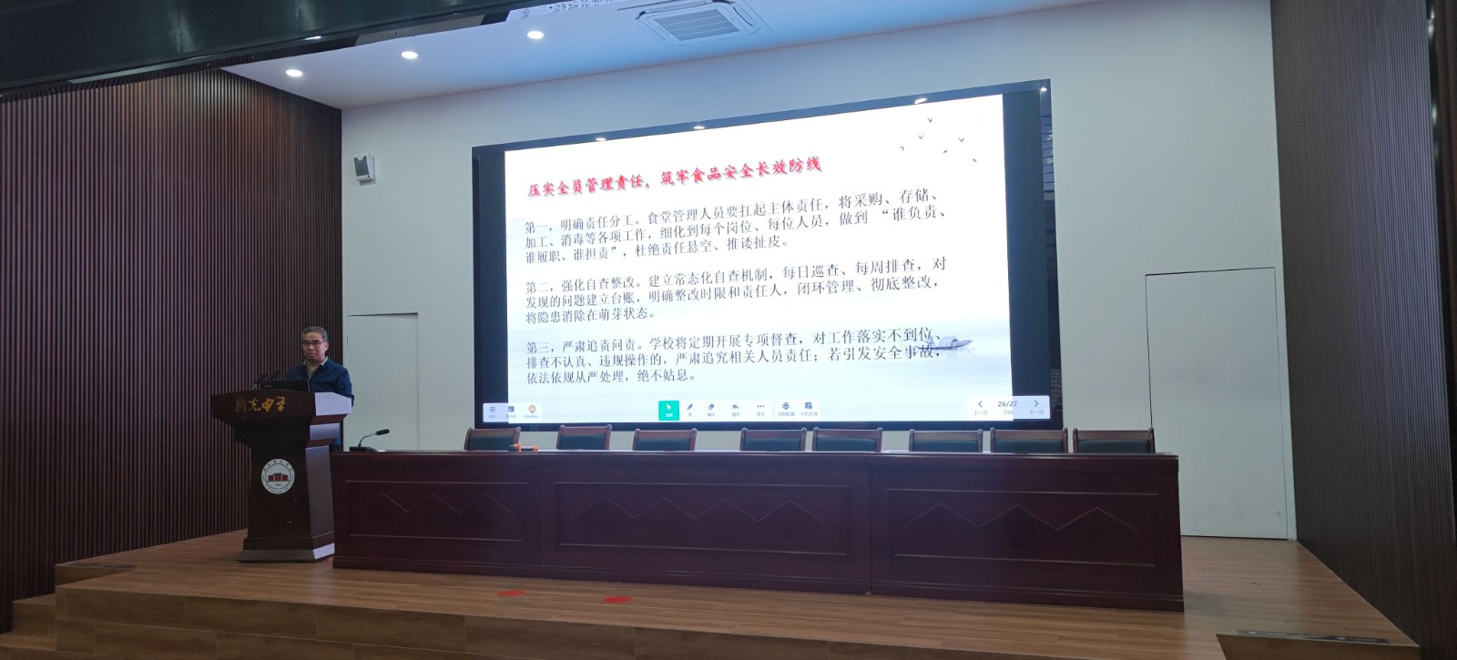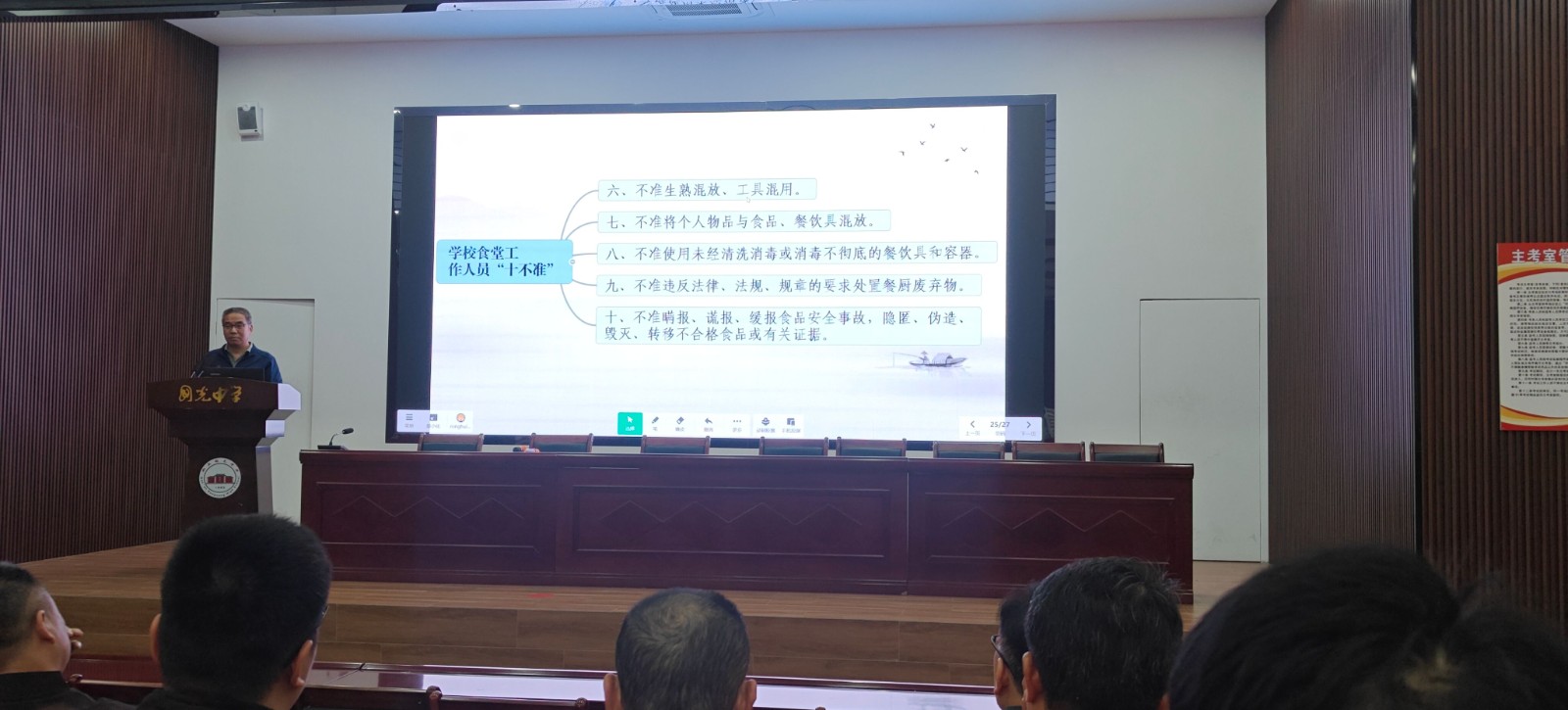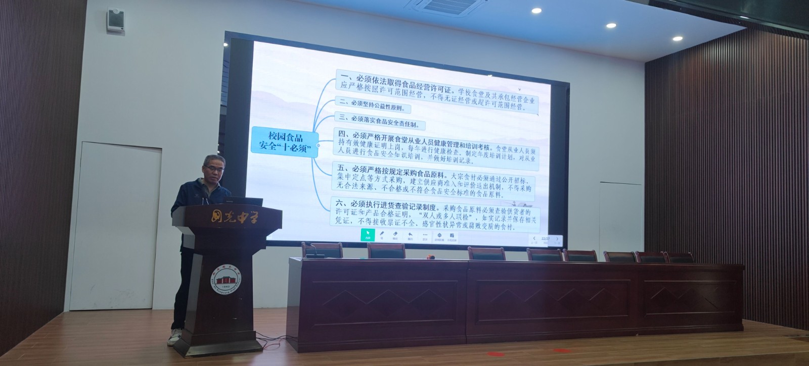 戴荣辉副校长围绕《校园食品安全“十必须”》《学校食堂工作人员“十不准”》开展专题培训,逐条解读核心要求:
